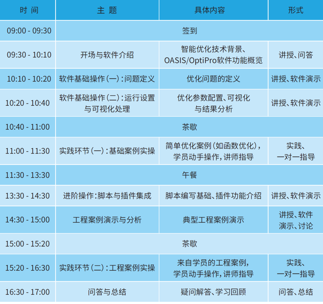 邀请函|OASIS/OptiPro智能优化软件专业培训在当今瞬息万变的工程与科研领域,智能优化技术已成为提升效率、降低成本和创新突破的关键。它通过先进的算法和计算方法,解决传统手段难以应对的复杂问题,从而在产品设计、流程优化和决策制定等方面实现显著优势。本次OASIS/OptiPro智能优化软件专业培训,旨在帮助您深入掌握这一前沿技术,赋能您的工程实践。 本次培训将从基础入手,逐步深入,确保您全面掌握OASIS/OptiPro软件的核心功能与高级应用: 深入了解OASIS/OptiPro的强大功能、应用领域及其在智能优化领域的独特优势。 探索软件架构与核心模块,为后续操作打下坚实基础。 问题定义: 学习如何设置优化设计变量、优化目标及约束条件,精准构建优化模型。 运行设置: 掌握优化所需的各项核心配置,确保高效运行。 可视化与结果分析: 利用可视化工具,直观理解优化过程;通过结果列表,深入分析和解读优化结果。 进阶操作: 脚本集成: 学习如何通过脚本语言扩展OASIS/OptiPro的功能,实现自动化工作流和定制化需求。 插件集成: 探索如何与其他专业软件进行无缝集成,构建更全面的优化解决方案。 案例实操: 通过一系列精心设计的真实案例,演示软件在不同领域的具体应用,让您将理论知识与实际操作深度结合。 太 泽 科 技 深度融合理论与实践: 我们不仅教授软件操作,更注重智能优化理论与工程实践的紧密结合。 海量工程案例讲解、练习及实践: 培训过程中将提供大量来源于实际项目的案例,并通过动手练习和实践环节,确保学员真正掌握软件的应用技巧。 经验丰富的讲师将提供一对一的个性化指导和答疑,帮助学员解决学习中遇到的具体问题,确保学习效果。 本培训特别适合以下领域和行业的专业人士和团队: •航空航天、核工业等高科技领域的研发、设计和工程人员。 •对智能优化技术有深度需求的各类工程、制造及科研机构。 •希望提升设计效率、优化产品性能、降低研发成本的企业和团队。 无论您是初学者还是希望提升优化技能的资深工程师,本次培训都将为您提供宝贵的知识和实践经验,助您在各自领域取得突破。 2025年7月24日 9:00-17:00 扫描二维码